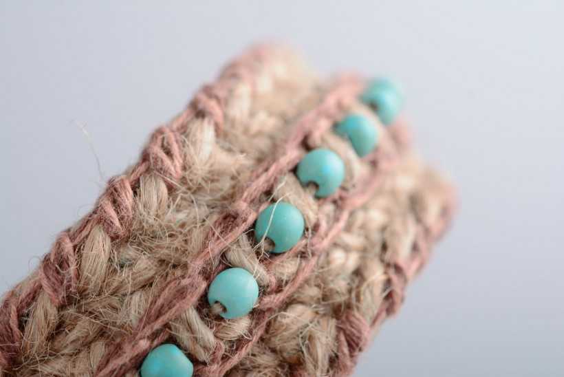 Джут, несмотря на грубую текстуру, – податливый материал, с ним можно пробовать различные техники, например, вязание, макраме, филигрань, новички могут просто обмотать цветочный горшок, промазанный клеем, джутовой веревкой.