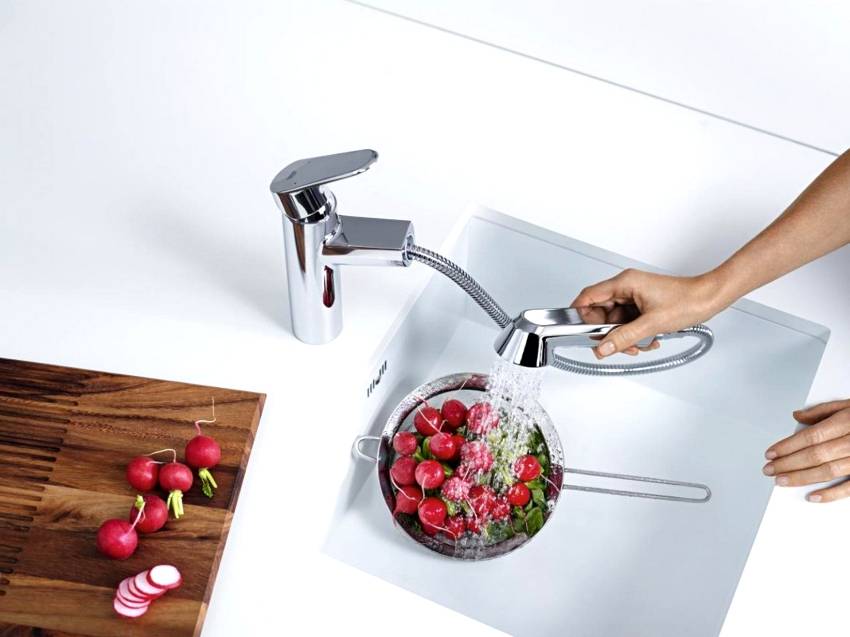 - гибкий излив просто незаменим для мытья продуктов, которые трудно мыть, держа на весу.