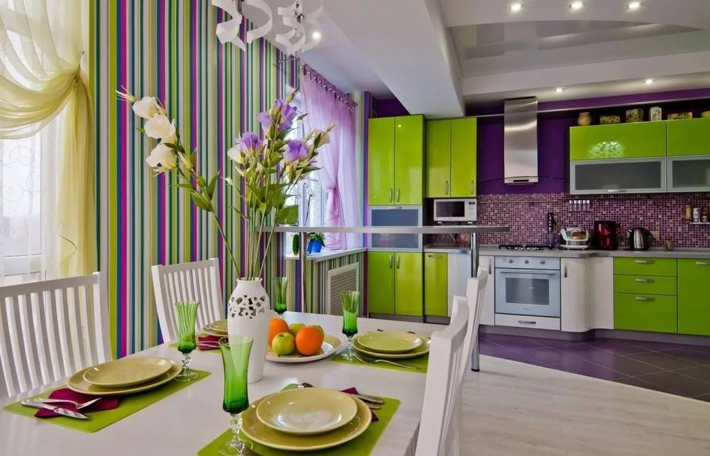 Если мебель светлая и однотонная, то стены кухни допускается делать яркими