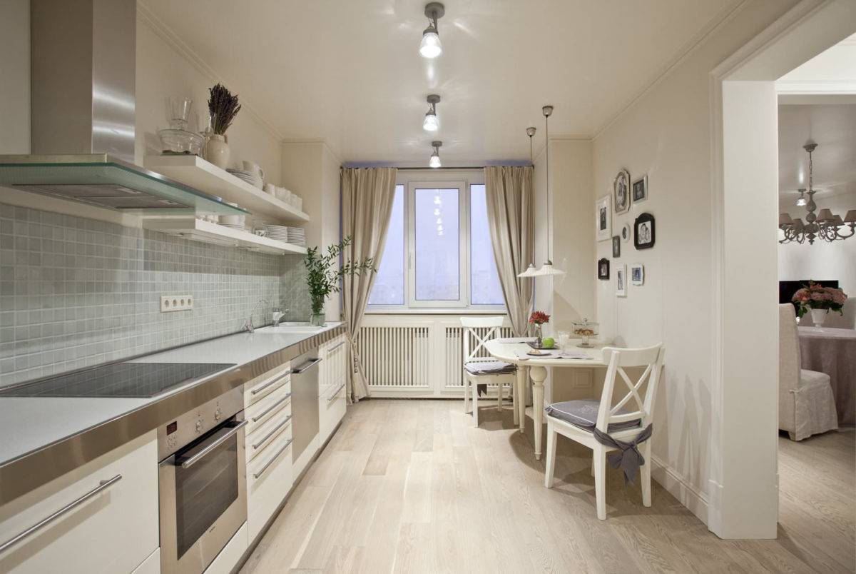Когда речь идет об оформлении узкой кухни, то в этом случае для отделки стен советуют использовать светлые тона. Мебель в узком помещении не должна «сливаться» со стенами. Например, если стены светло-серые, то мебель лучше выбрать с белыми фасадами. Деревянная светлая мебель будет хорошо смотреться, если был выбран светло-коричневый цвет стен для кухни.