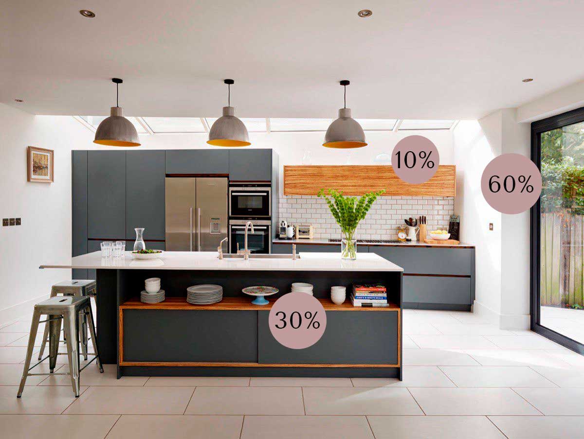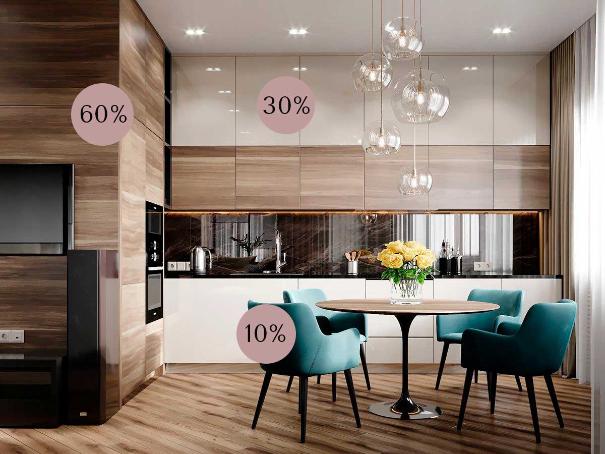 - 60% – составляет доминирующий, он же основной, он же фоновый, цвет кухни. Базой выбирается цветовое пятно, которое занимает большую часть помещения, как правило это – стены и их цвет (обои, покраска, панели, керамическая плитка или мозаика и т. д.). Также к основным цветовым площадям можно отнести фасады гарнитура.