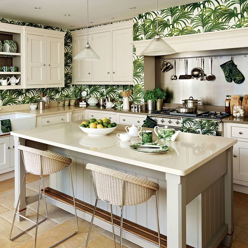 Зеленый. Насыщенный зеленый будет тяжело смотреться в качестве доминирующего фона, но более светлые его оттенки удачно гармонируют с белыми фасадами мебели, с молочными, кремовыми или светло-серыми элементами декора.
