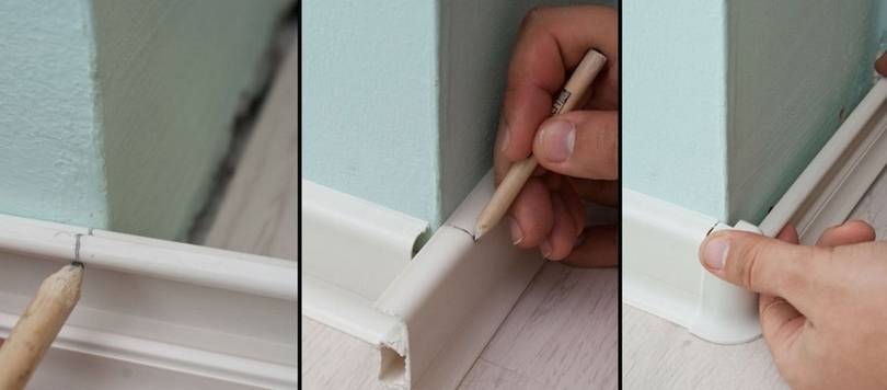 Если будет использоваться планка целиком, то на сторону, примыкающую к углу, надевается соответствующий элемент, после чего изделие приставляется по месту его будущего расположения