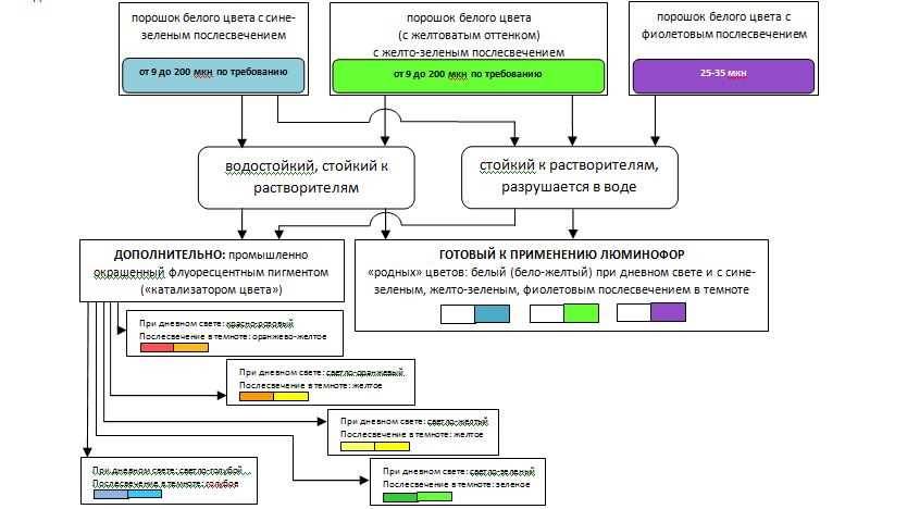 - порошки – все устойчивы к растворителям, продукт белого цвета, обладающий зелено-синеватым послесвечением, водостойкий, остальные (фиолетовое и желто-зеленое свечение) необходимо защищать от влаги более качественно;