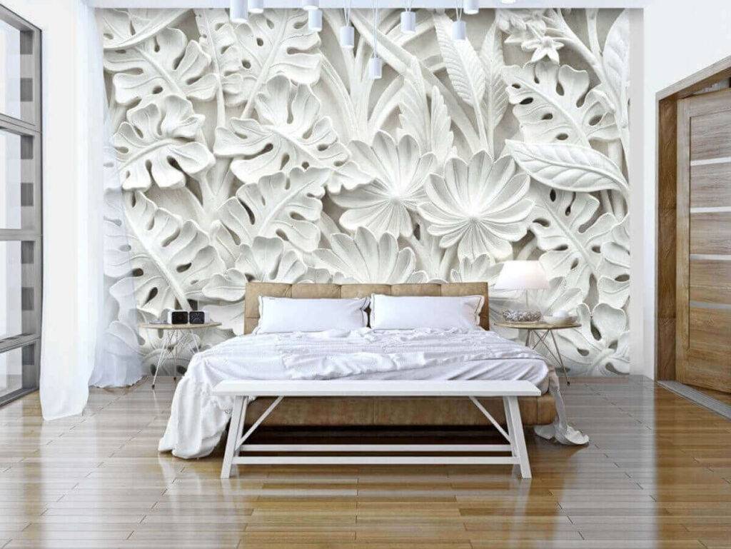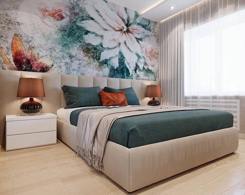 Благодаря подобной отделке, одна стена становится объемной, и на ней акцентируется внимание. Если спальня совсем крохотная, большой рисунок может занимать часть стены, но в любом случае он будет хорошо заметен