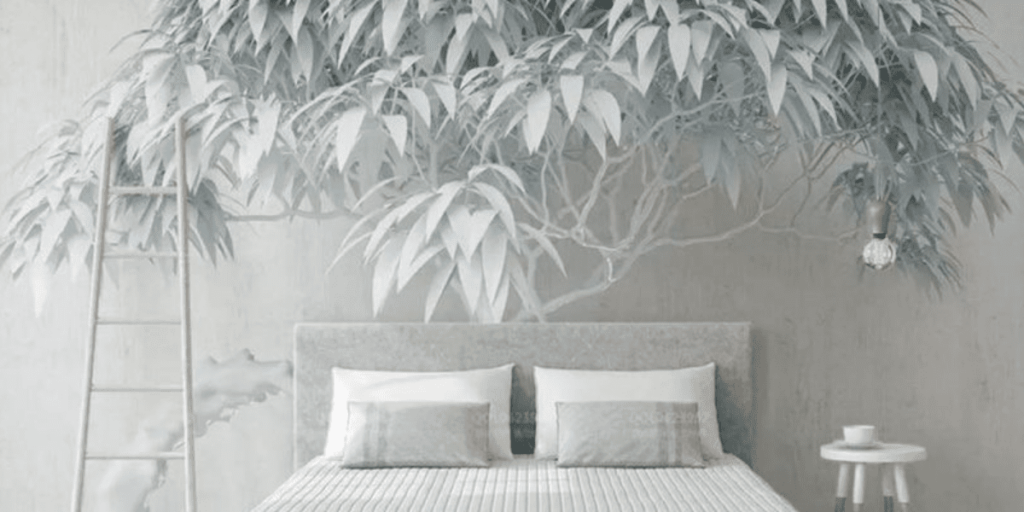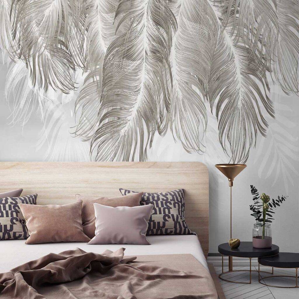 Для украшения одной стены малогабаритной спальни можно задействовать крупные элементы, например, разместить их над изголовьем кровати, а также выбрать произвольную область. Тогда все остальные стены желательно оклеить светлыми однотонными обоями или с незаметным узором.