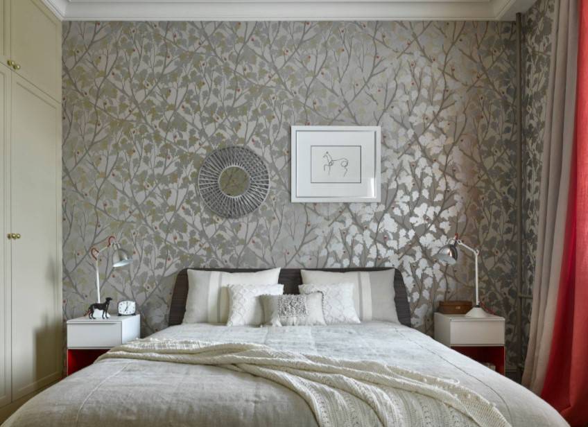 Обои для спальни в хрущевке лучше выбирать светлые, пастельные, с мелким неярким рисунком и светоотражающими деталями. Полностью глянцевое полотно выявит все неровности стен, а вот комбинация матового фона и зеркальных узоров — наоборот, скроет их.
