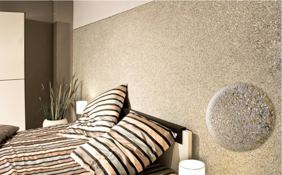 Из такого порошка делается паста, которая наносится на стены. После высыхания полотно обладает прекрасной теплоизоляцией. Узорам не страшен ультрафиолет и перепад температур. Поскольку этот вид отделки боится влаги, применение в спальне будет идеальным вариантом отделки.
