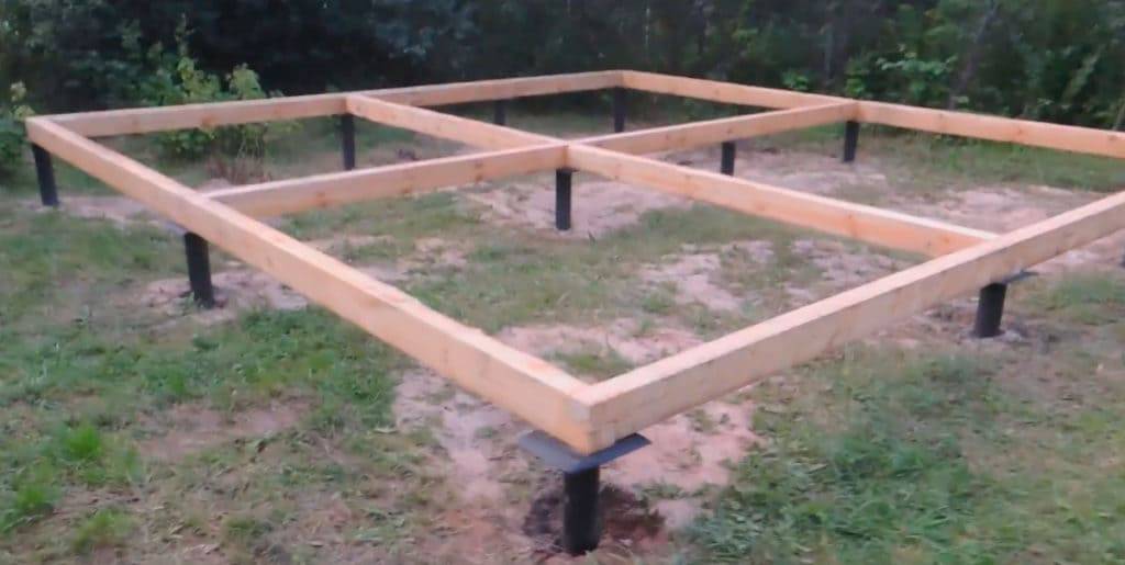 Если выбран свайно-винтовой фундамент, то вначале монтируют ростверк. Обвязку начинают с укладки балок на оголовки свай и крепления. Вот фото обвязки ростверка из бруса 150х200 мм.