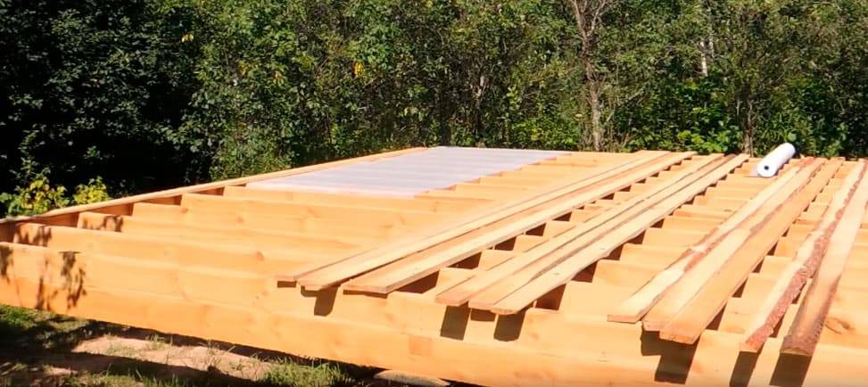 По периметру фундамента, сверху крепятся доски и закрепляются анкерами, на расстоянии не реже 2м. Далее устанавливаются лаги, для этого возьмите балки из древесины поперечного сечения 10х12 сантиметров и поместите на основание обвязки с интервалом 0,6-0,7 метра. Крепление обеспечивается саморезами и металлическими уголками.