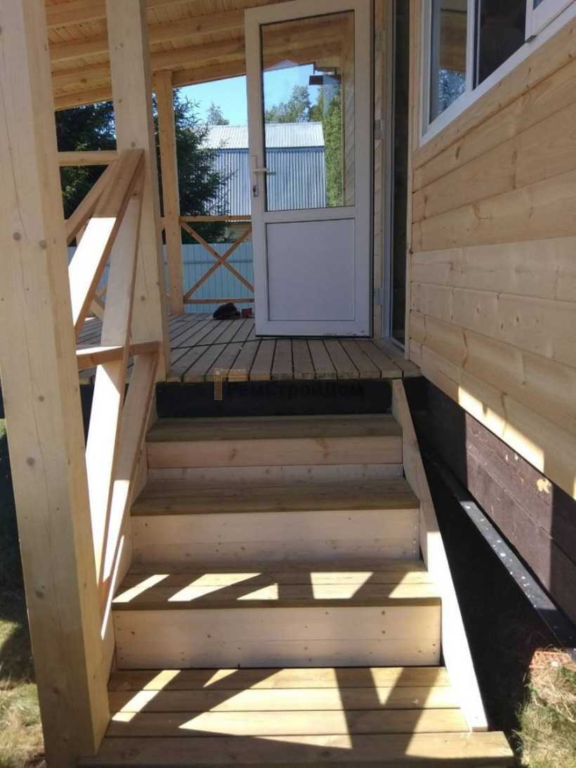 Еще один элемент зависит от высоты цоколя дома. Настил террасы обычно расположен в одном уровне с полом первого этажа. Если цоколь высокий, то, чтобы спуститься во двор, делают либо ступеньку, либо небольшую лестницу с перилами.