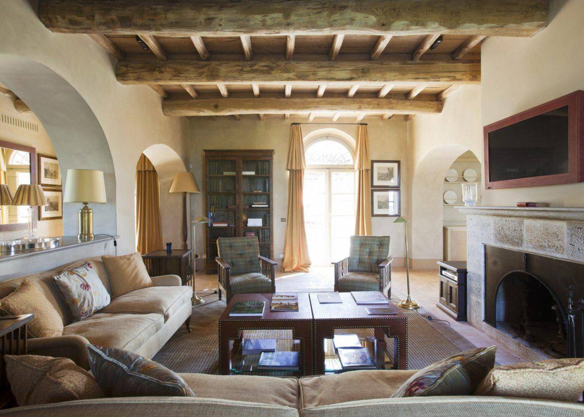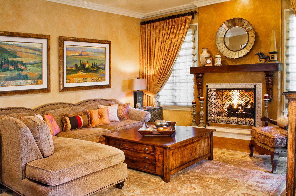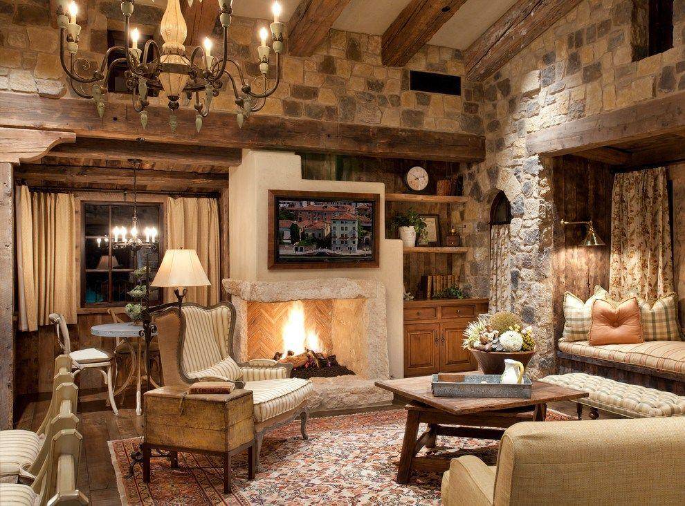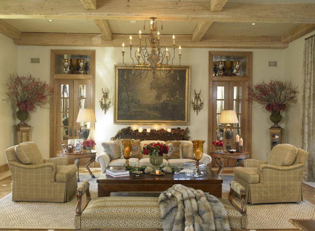 Для гостиной подходят как классическая разновидность с её пышностью и роскошью, так и слегка брутальные стили с нотками кантри (тосканский, деревенский). Пол в гостиной можно отделать керамикой или деревом, стены – покрасить или оштукатурить.