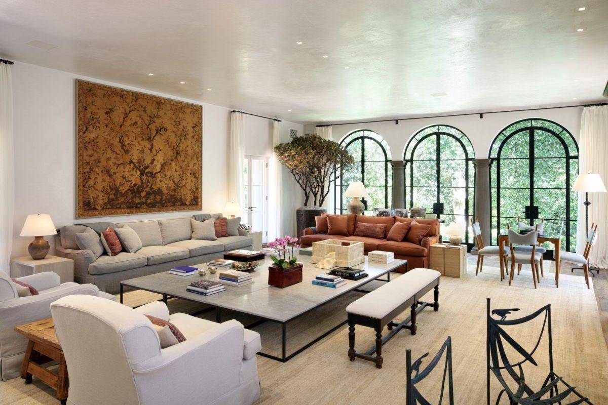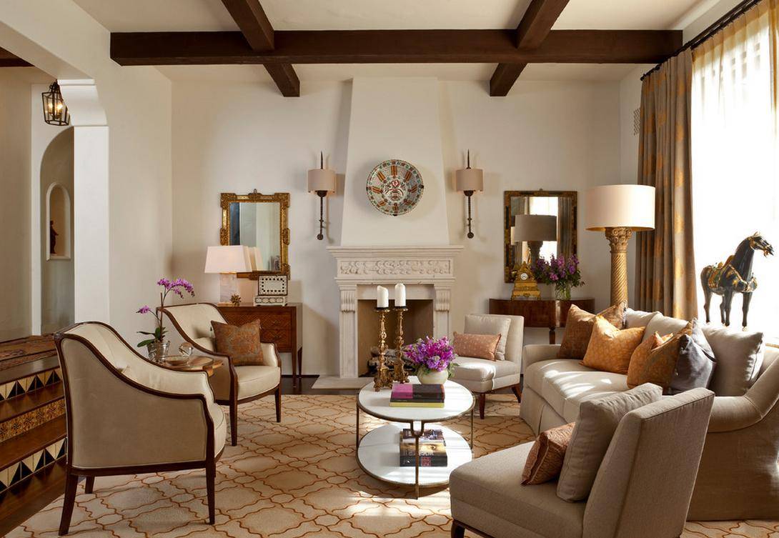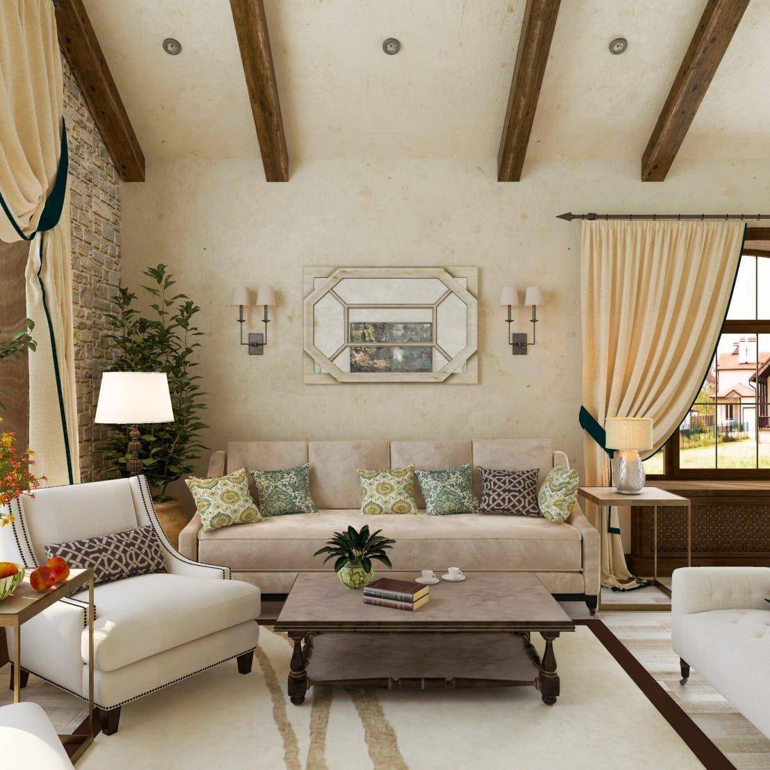 Для гостиной подходят как классическая разновидность с её пышностью и роскошью, так и слегка брутальные стили с нотками кантри (тосканский, деревенский). Пол в гостиной можно отделать керамикой или деревом, стены – покрасить или оштукатурить.