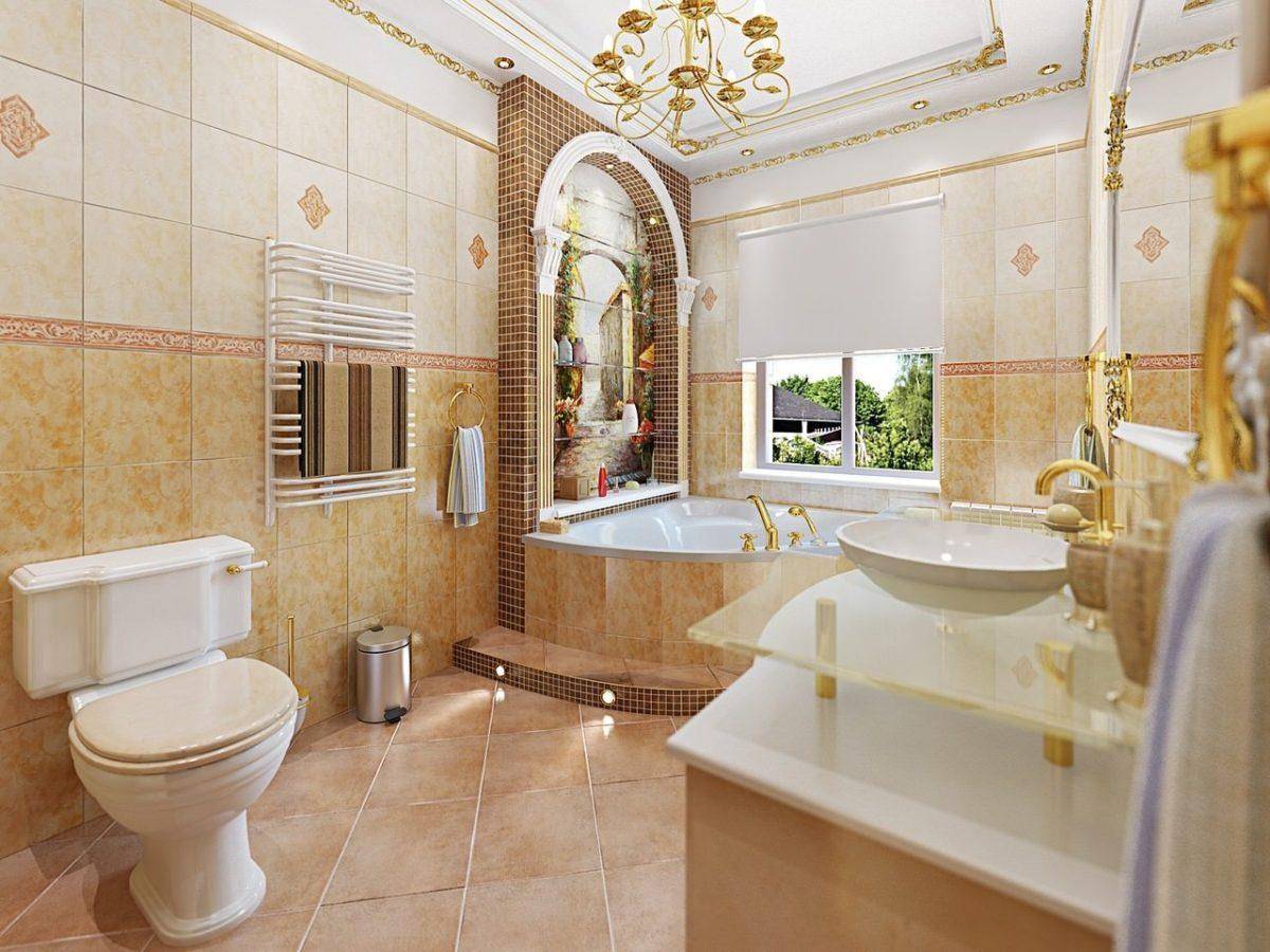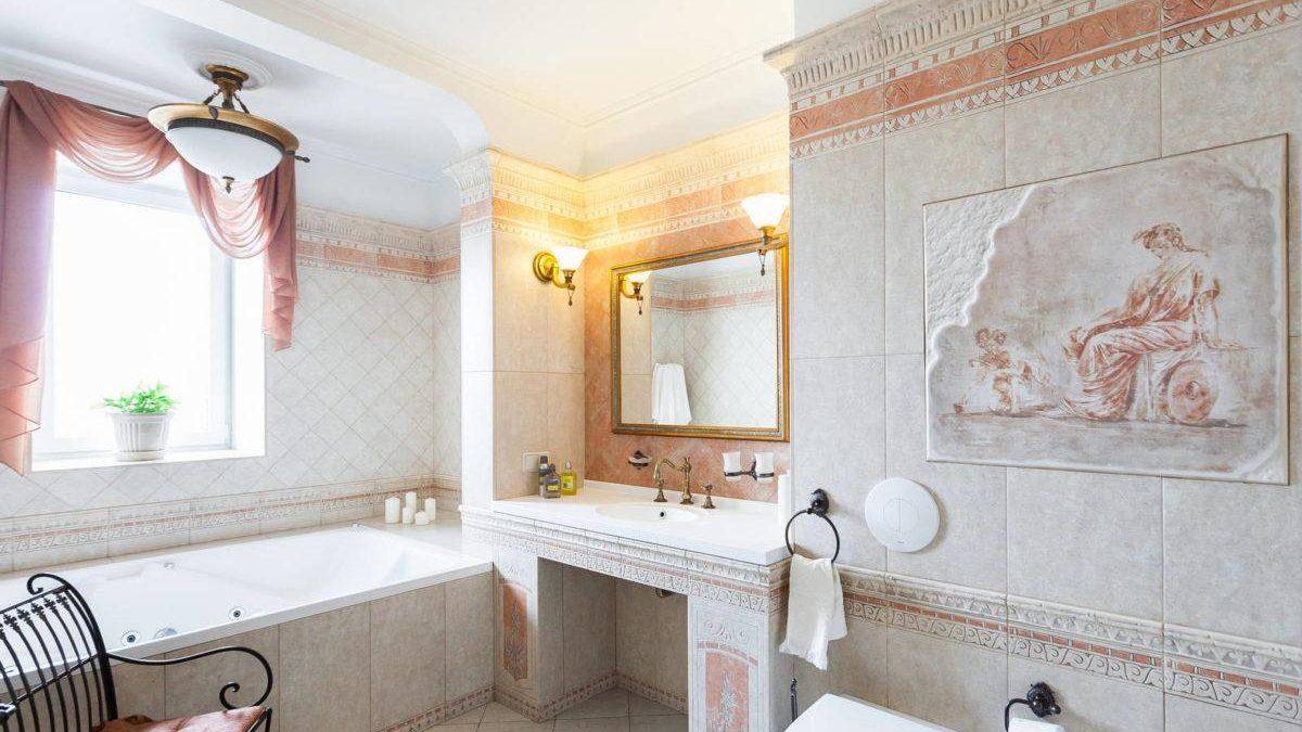 Доминирующий отделочный материал в данном случае – керамическая плитка. Стены можно отделать и водостойким штукатурным составом. Интересно будет смотреться стилизация под неаполитанский дизайн: мозаичная отделка пола, росписи на стенах и миниатюрные светильники.