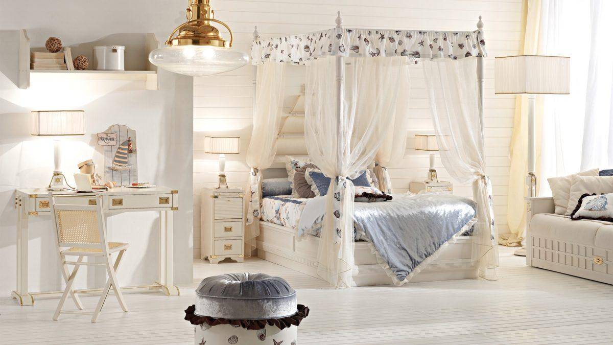 Для освещения подойдет комбинация кованой люстры и небольших настенных светильников сферической формы. Для хранения одежды, книг, принадлежностей для творчества подойдут открытые полки или комоды с выдвижными ящиками.