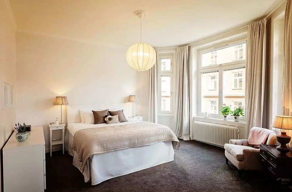 В заключение рассмотрим пример того, как можно придать сдержанному скандинавскому дизайну романтичность и элегантность. Цвет кофе с молоком, утончённые торшеры, подвязанные шторы, окантовка на покрывале, немного лепнины под потолком и рельефные подушки на скамье украшают интерьер, сохраняя общую концепцию.
