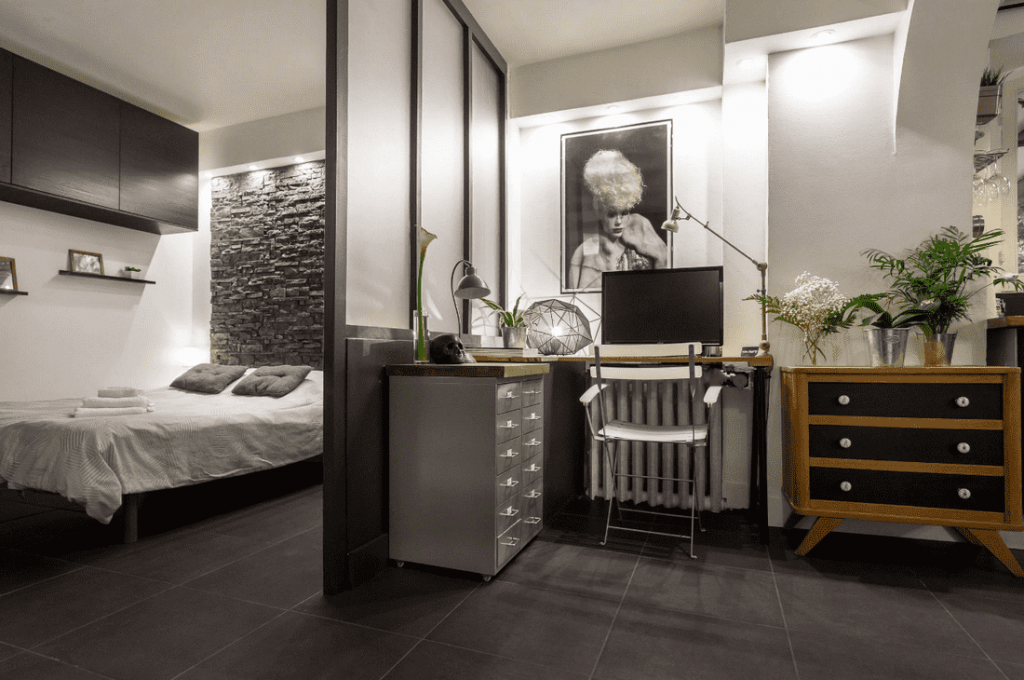 Если в спальне расположено рабочее место, отделить его можно с помощью перегородок или штор. Если для зонирования выбирать текстиль, лучше приобретать специальные шторы, не пропускающие свет – blackout.