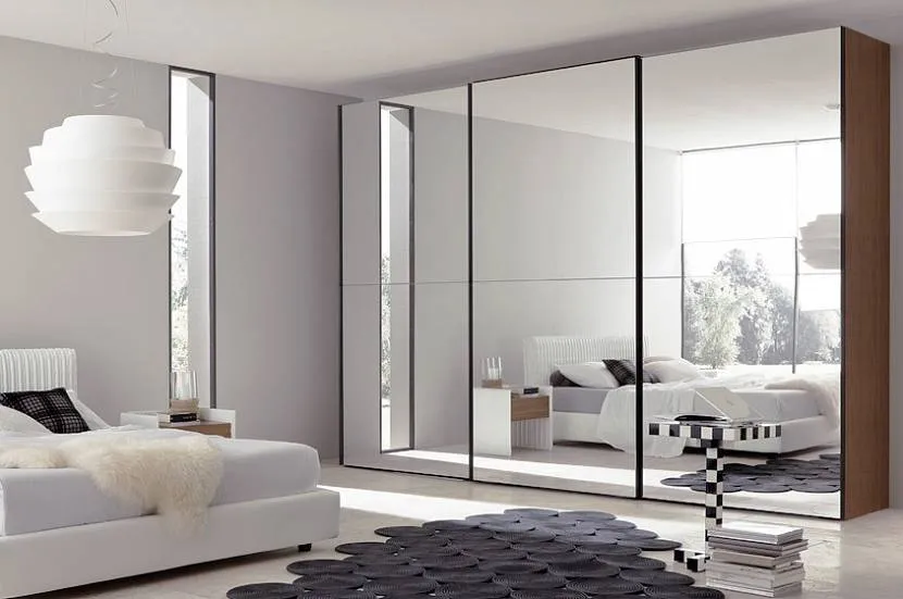 Зеркальные или глянцевые стенки помогут сделать спальню светлее, просторнее и выше. Гладкие фасады облегчат уборку и не дадут пыли ни малейшего шанса остаться на поверхности.