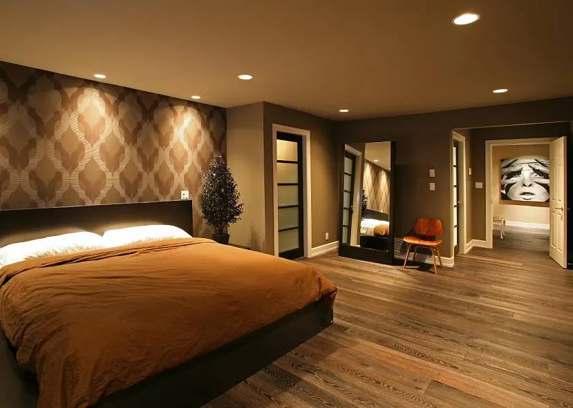 В коричневой комнате напольное покрытие лучше сделать из доски. Традиционно оттенок материала выбирают на пару тонов темнее общего оформления. В маленькой спальне дизайнеры рекомендуют использовать выбеленные сорта, в большой красиво смотрятся насыщенные дубовые и вишневые виды отделки. Сверху кладут ковер или палас, повторяющий геометрическую форму.