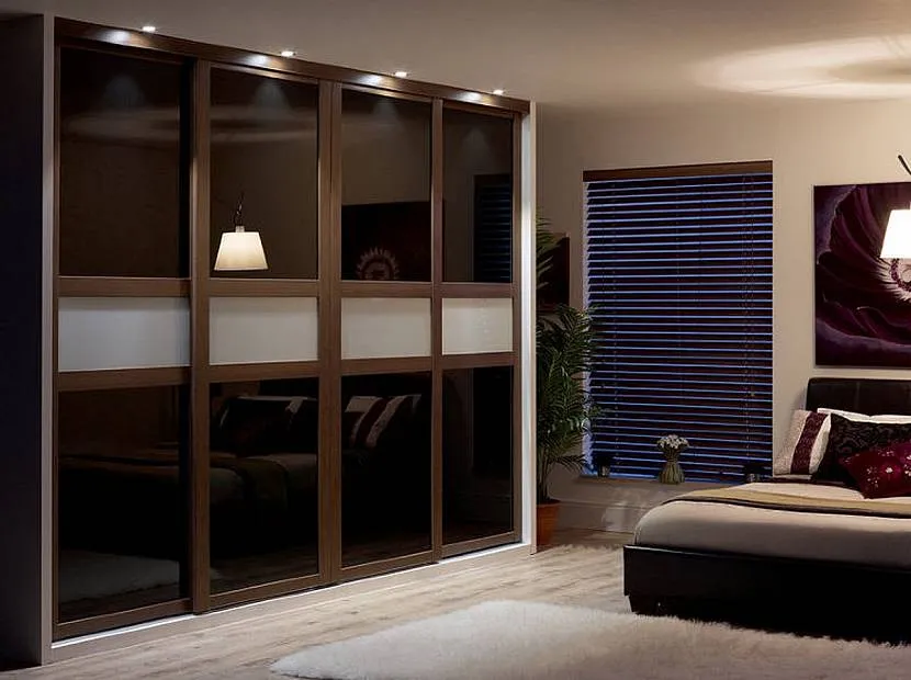 Шкаф-купе выполняет роль гардероба. Фасады мебели по дизайну перекликаются с оформлением кровати или обоев на стенах. В темной комнате раздвижная дверь часто имитирует оконный проем. Подсветка в системе хранения позволяет визуально откорректировать недостатки пространства.