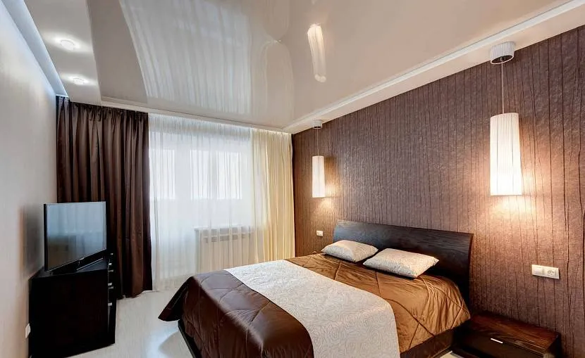 Пространство над головой традиционно оформляют светлым. На белом или бежевом покрытии хорошо видны фигурные детали подвесной конструкции и лепнина. Темно-коричневый или комбинированный вариант уместен в спальне неправильной формы.