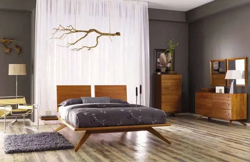 Для отделки стены над кроватью можно использовать панно из натурального дерева. Такие поверхности активно используются в этом стиле. Растительные мотивы приближают нас к природе и добавляют модерновый колорит.