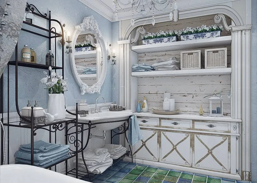 Как и в жилых комнатах, в ванной можно использовать изящные светильники с хрусталем, текстиль, старинную мебель.
