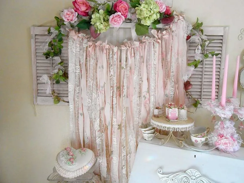 Шторы в стиле шебби шик должны быть характерного для этого стиля цвета, а также у них должна быть разнообразная отделка – подхваты, банты, воланы.