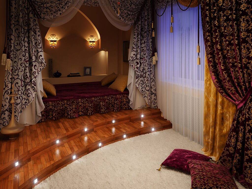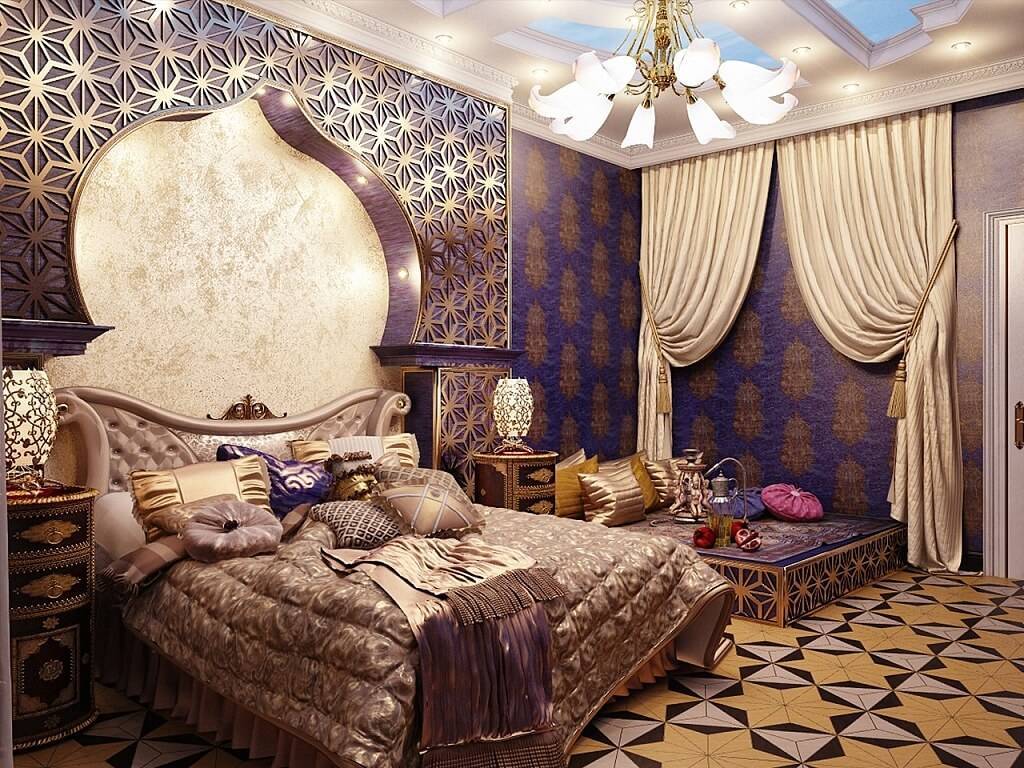Но чаще всего, если говорить именно про «восточный» стиль в дизайне, подразумевают такие страны, как Марокко, Тунис, Объединенные Арабские Эмираты и иные арабские государства. Спальня, обустроенная в арабском стиле, может перенести каждого человека в популярную сказку «1000 и 1 ночь». Лишь эксцентричный и обожающий эксперименты человек решиться на оформление свой спальной комнаты, подражая марокканским дворцам, которые утопают в роскоши.