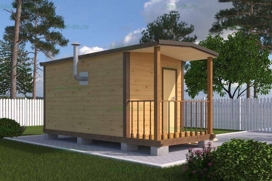Например, представленный на рисунке проект. Это популярный вид мобильной бани. Он отличается компактными размерами. Состоит из двух функциональных помещений: