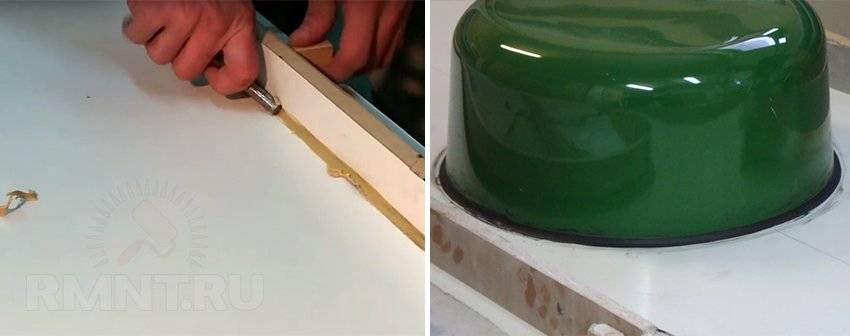 После того, как внешний контур сформирован, в прорези под раковину или нагревательную плиту добавляется опалубка. Если раковина будет литой, вам понадобится акриловая матрица. Он приклеивается точно так, как указано термоклеем, А затем нажимает таблицу с вашим весом. Избыток клея отрезал сапожник ножом.