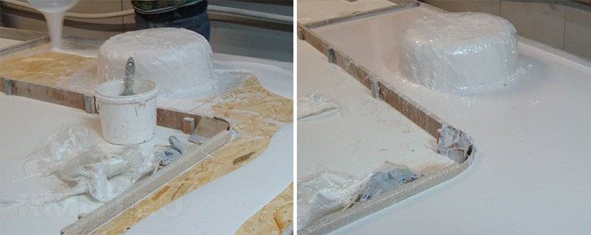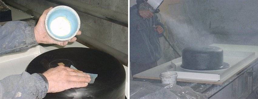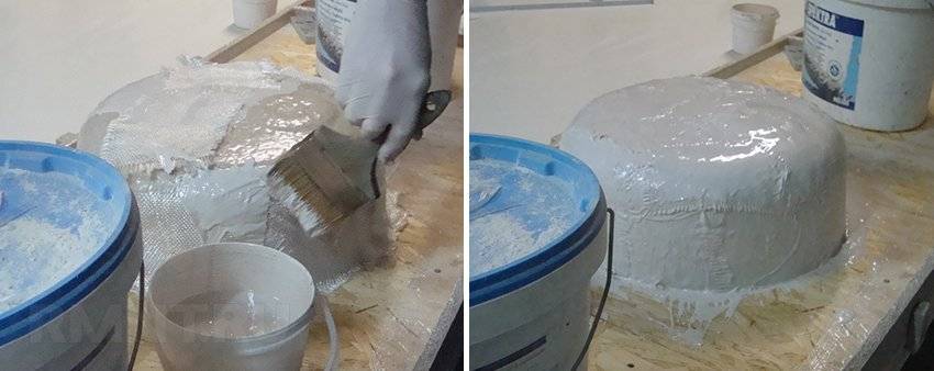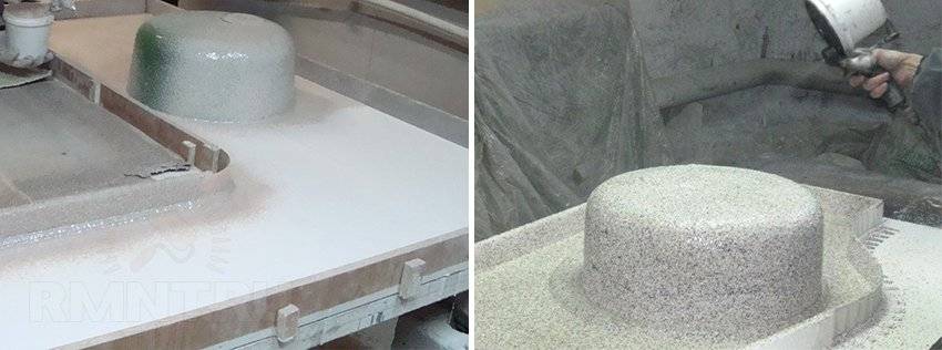 Опалубка очищается от пыли и покрывается тонким равномерным слоем воска, который используется для предотвращения прилипания жидкого акрилового состава. Согласно инструкции по изготовлению жидкого камня выполняется производство сырьевой смеси. В определенном соотношении смешиваются акриловый гель, минеральная крошка и отвердитель. При помощи пистолета-пульверизатора с большим соплом жидкая смесь наносится на внутреннюю поверхность опалубки слоем не более 1 мм. После высыхания поверхности наносится второй шар толщиной 3 мм.
