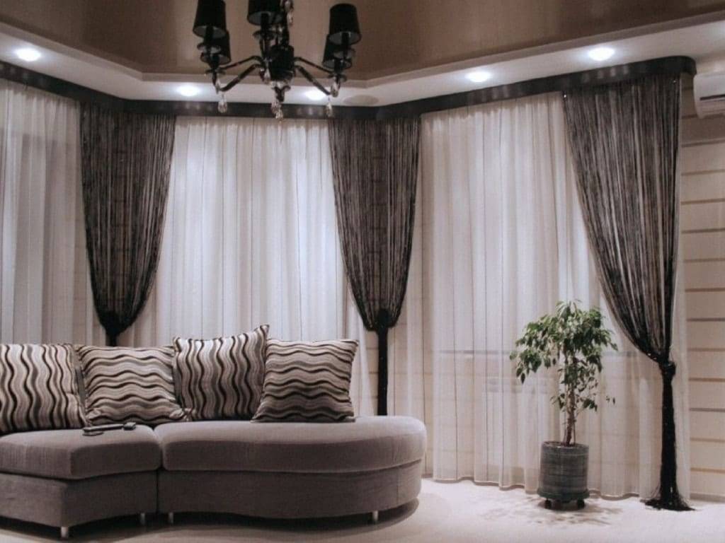 В зале с окном необычной формы, можно использовать асимметричные шторы