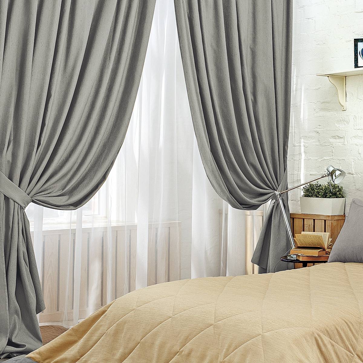 В спальне используют шторы из тяжелой ткани и дополняют тюлем.