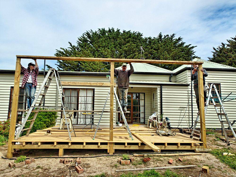 - Скрепляют веранду вместе с домом, используя для этого вертикальные брусья.