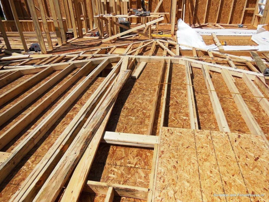 Сами фермы и большие стены поднимаются не вручную, а краном, что также значительно ускоряет процесс возведения каркасного дома.