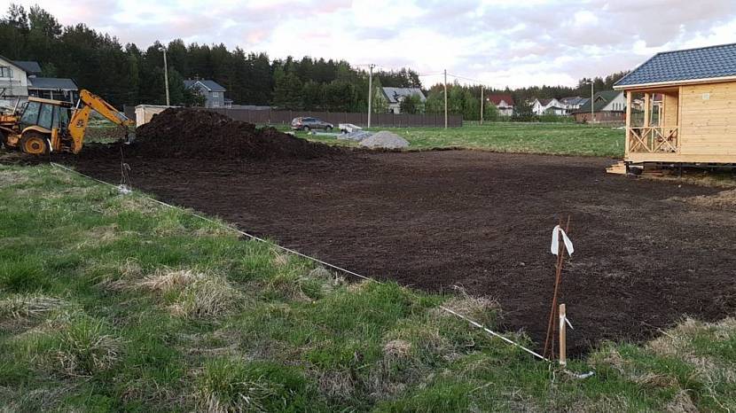 Первым делом на площадке определяется расположение и ориентация постройки. После этого осуществляется выравнивание пятна застройки.