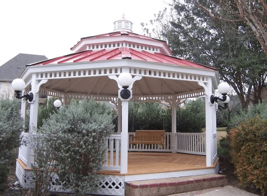 Кирпичные беседки очень часто встречаются в шестигранном формате, но несколько идей для восьми граней были также обнаружены. Ниже представлена фотография с кирпичной обшивкой столбов.