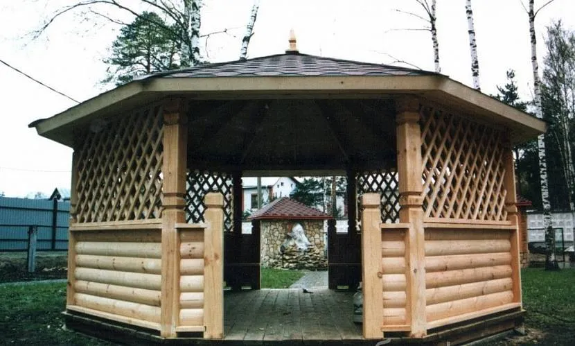 Брус является наиболее универсальным строительным материалом для беседок, в том числе и восьмигранных. Его можно с удобством использовать как для возведения опорных столбов, так и стропильной системы.