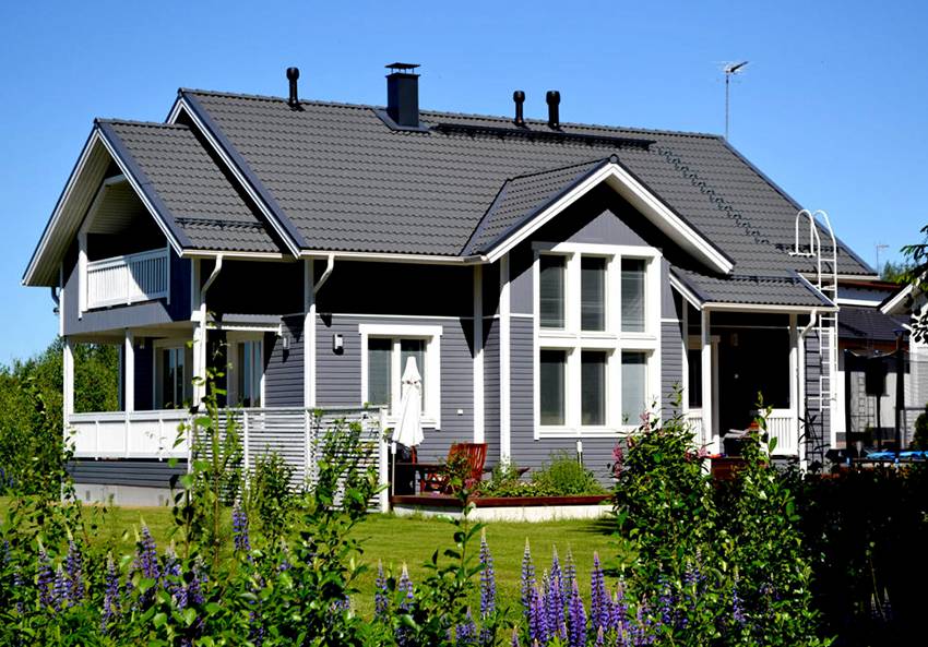 В качестве кровли подходит использование черепицы или металла под покраску. Из-за сурового северного климата в основном выбирают материалы в темных серых или насыщенных коричневых тонах.