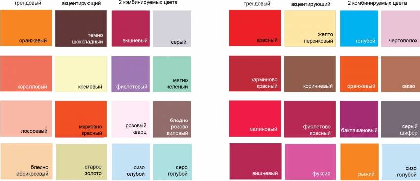 Многие задаются вопросом о том, как же пользоваться таблицей сочетания цветов в интерьере? Иногда это сложно и не совсем удобно. Ниже представлены таблицы сочетания цветов в доступном и понятном виде, где расписаны все популярные оттенки. Трендовый цвет — основной, далее идут подходящие к нему цвета, которые можно смело комбинировать. Акцентирующий цвет придаст интерьеру яркости и креативности.