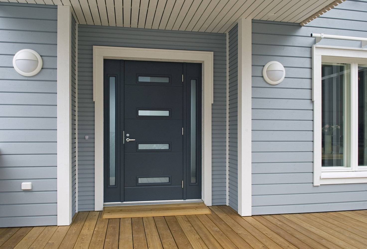 В продаже имеются финские деревянные входные двери различных цветов, от привычного нам темно-коричневого до пастельных оттенков белого, синего, красного. Кроме того, большинство моделей входных конструкций для загородного дома имеют покрытие, имитирующее фактуру и цвет натуральной древесины (сосна, тик, бук, дуб и прочее) как в виде цельного массива, так и в виде евровагонки. Подобное разнообразие расцветок и строгий дизайн позволяют подобрать модель, которая органично впишется практически в любой интерьер.