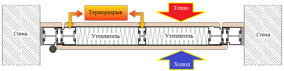 В дверных блоках теплоизоляционный материал делят на несколько слоёв. Переходы между слоями утеплителя и будут выполнять роль терморазрыва.