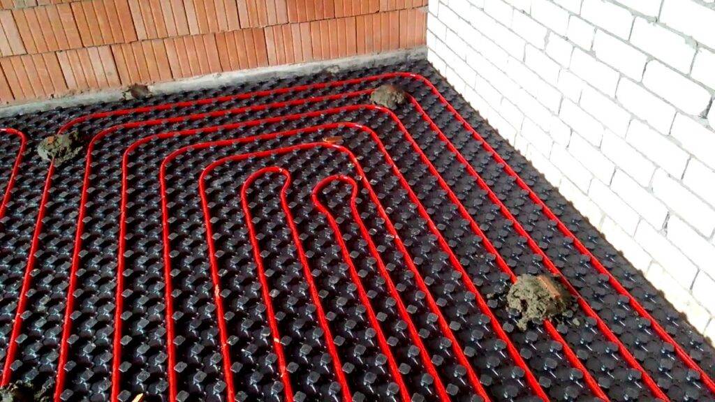 | Полимерные маты. Для решения значительной части проблем, связанных с теплопотерями, деформацией и намоканием поверх чернового настила можно также уложить полимерные маты с канавками для укладки труб. Функционируют они так же, как и фрезерованные панели из ДСП, но эффективность у этих изделий выше. Минус — высокая цена, которая компенсируется экономией на обогреве только частично. |