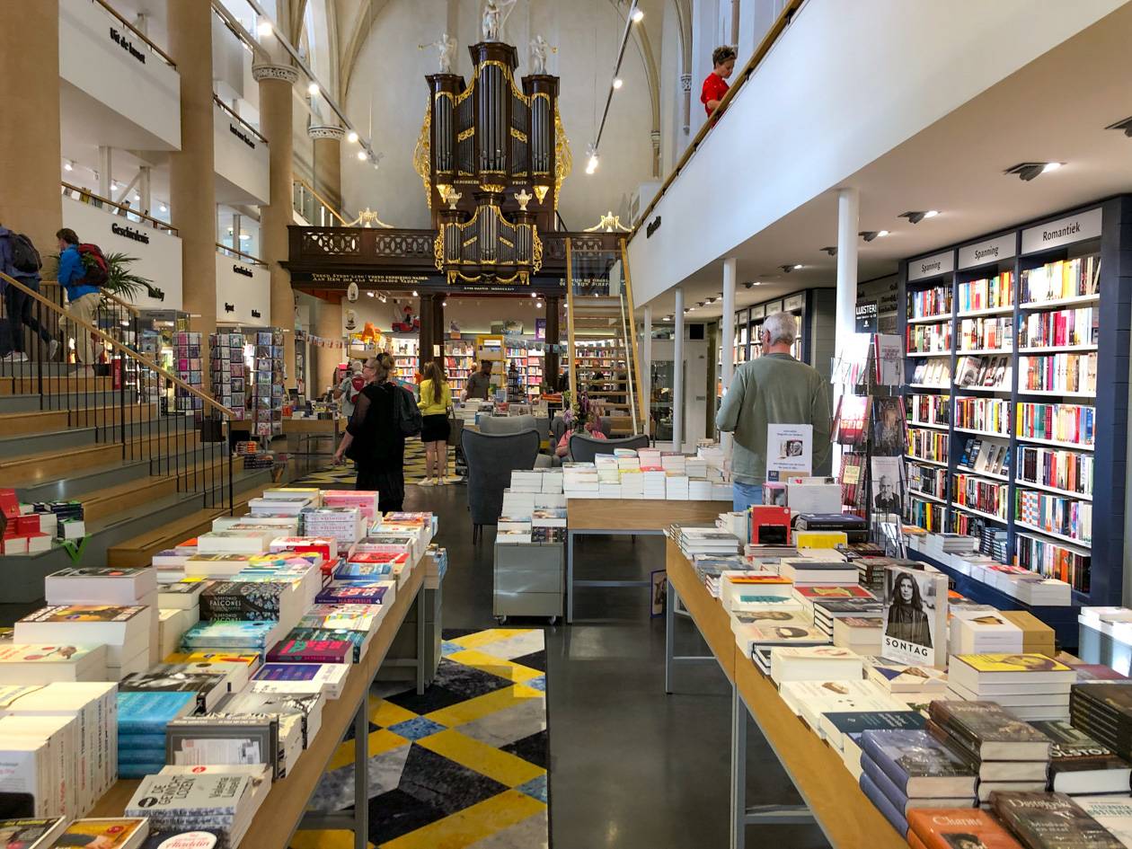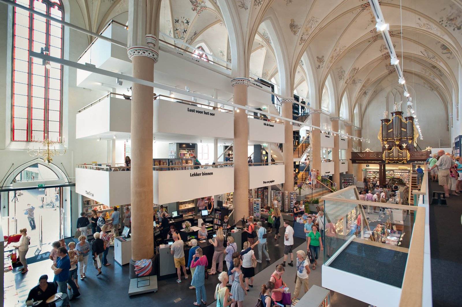Побудем еще немного в Голландии, но отправимся в другой город — Зволле. Waanders — семейная компания, которая в 1836 году начала издавать и продавать книги. Больше 150 лет компания процветала, но к 2000 годам ее финансовое положение пошатнулось — по всей стране начали открываться крупные сетевые книжные магазины, а маленькие лавки начали терять былую популярность. Особенно сложно было книжным в небольших городах — как раз таких, как Зволле. Поэтому компания стала думать, как сохранить магазин. В 2005 году Waanders разработали план нового книжного — они решили открыть его в здании средневековой церкви Брурен, которая перестала функционировать еще в 1983 году и стала использоваться для проведения культурных мероприятий.