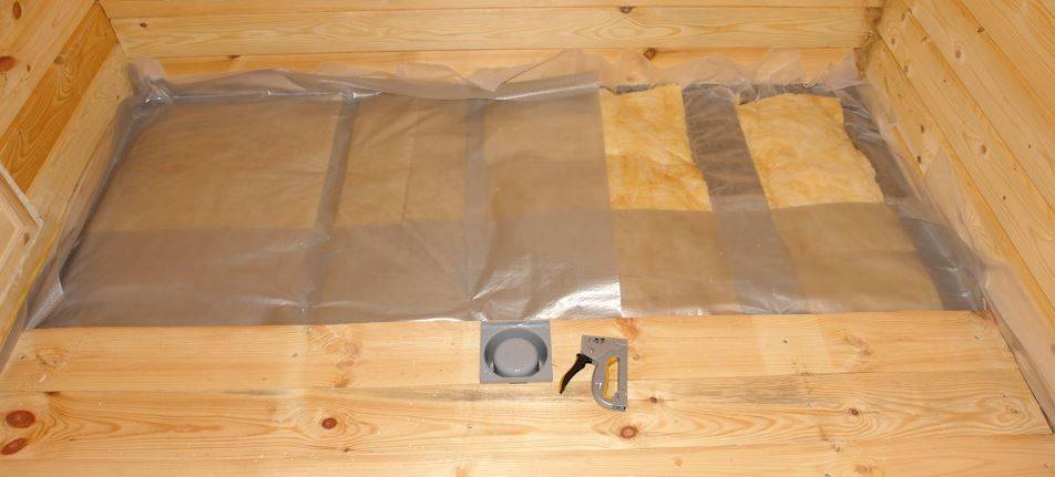 Далее укладывают пенополистирол (4-5 см). Следует приобретать качественные изделия надежного производителя с плотностью от 35 кг на 1 м. куб. и выше. Такие плиты обладают достаточной прочностью и низкой теплопроводностью. При правильном монтаже даже без дополнительных средств будет обеспечена хорошая герметичность. Пенополистирол отрезается без лишних усилий обычным канцелярским ножом. Поэтому подгонка отдельных элементов под форму конкретного пространства будет выполнена точно.