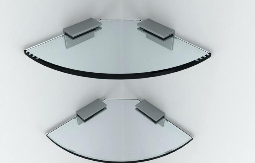 Угловые стеклянные полки крепят к стене с помощью специальных зажимов