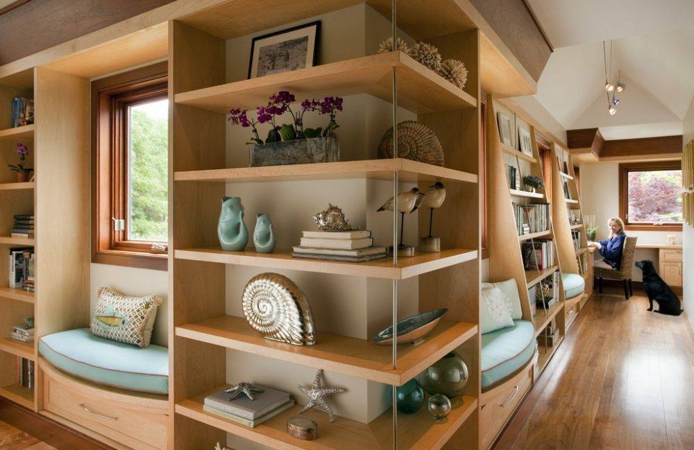 Полки с дополнительными элементами можно использовать в жилых комнатах. Они могут состоять из нескольких секций, либо иметь необычную форму, например, в виде буквы «Г».