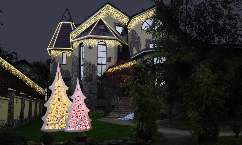 Комнатная светотехника для этой цели не подходит, существуют специальные уличные модели. Также в продаже есть светящиеся сосульки, их симметрично развешивают на ветвях деревьев.