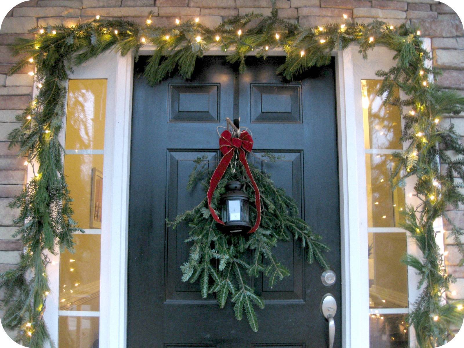 При наружном украшении обязательно стоит украсить входную дверь дома, так как ее украшение влияет на мнении о владельцах дома. Дверь и крыльцо стоит украсить различной светотехникой, особенно подойдут электрические гирлянды, обернутые вокруг еловых или сосновых веток (из которых можно соорудить венок). Также можно украсить дверь и крыльцо большими красными атласными бантами.